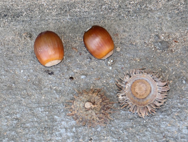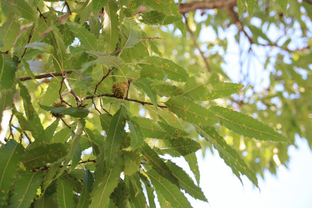 ▲クヌギの枝葉と落ちた「堅果」