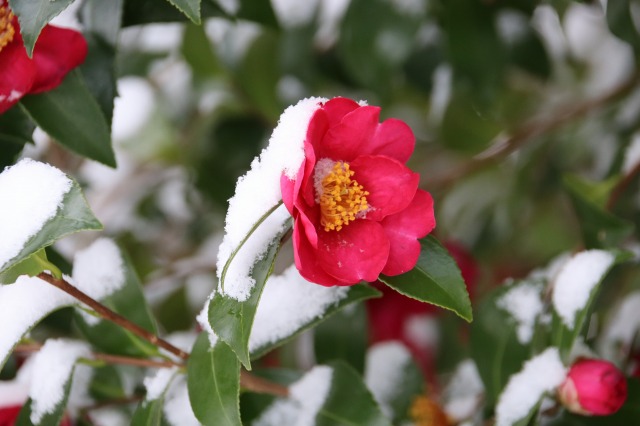 ▲カンツバキの花の雪ぼうし