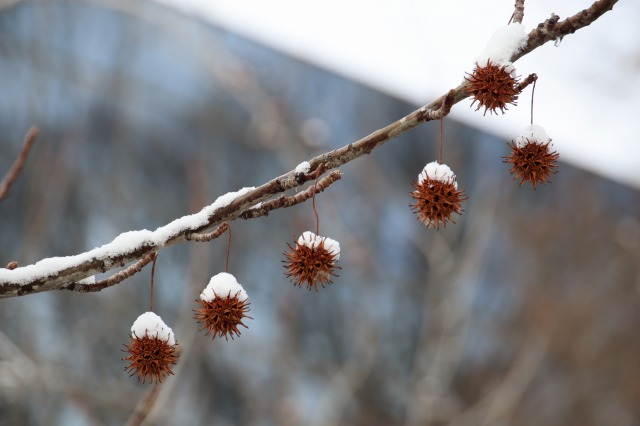 ▲モミジバフウの果実の雪ぼうし