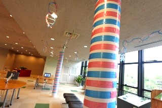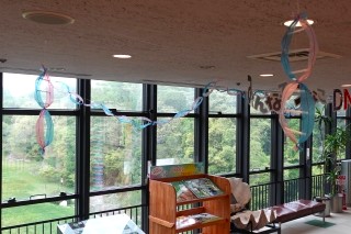 天井からゆらゆらと揺れるカラフルな螺旋(らせん)の飾り。