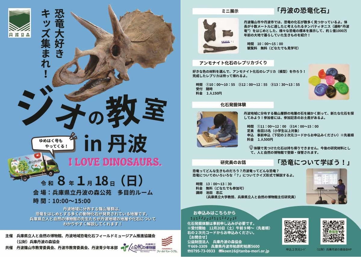 申込方法:化石発掘体験は事前申込制です(空きがあれば定員に達するまで当日参加を受け付けます)。事前申し込みは12月20日(土)9:00より兵庫県立丹波の森公苑の申込サイト で受け付けます(先着順)。