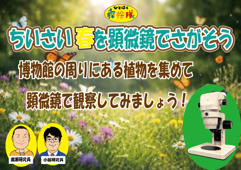 博物館の周りにある植物を集めて、顕微鏡で観察してみましょう。ふだんの春の景色も、顕微鏡を通して見ると、また違った表情を見せてくれます。