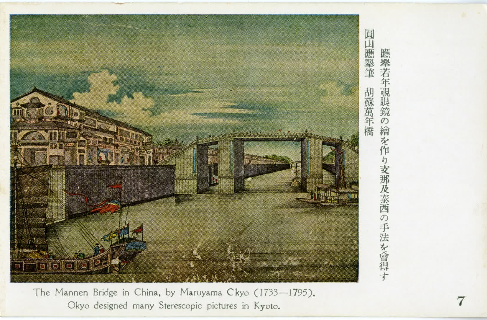 "写真入り郵便はがき應擧若年覗眼鏡の繪を作り支那及泰西の手法を會得すThe Mannen Bridge in China, by Maruyama Okyo(1733-1795). Okyo designed many Sterescopic pictures in Kyoto."