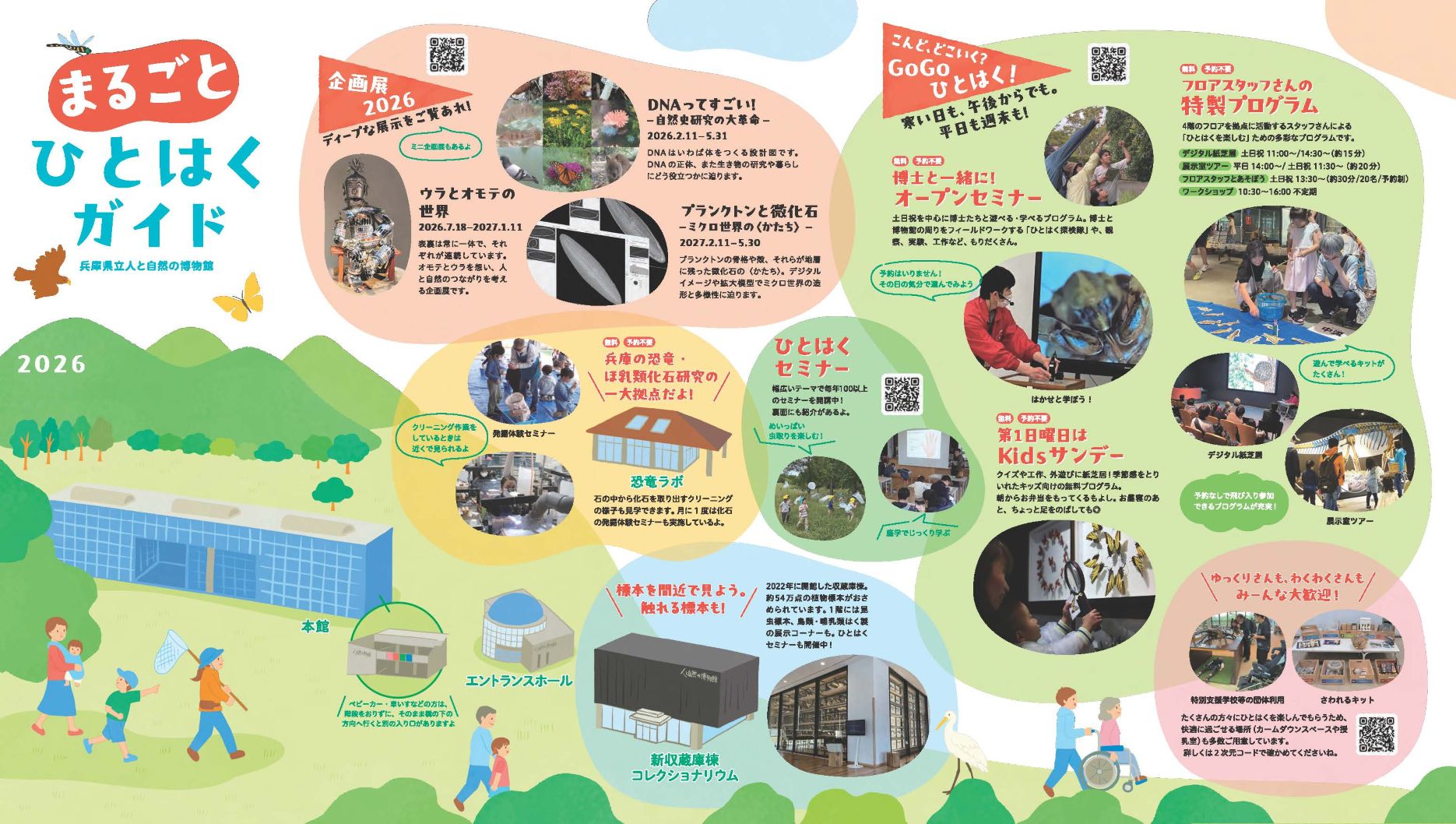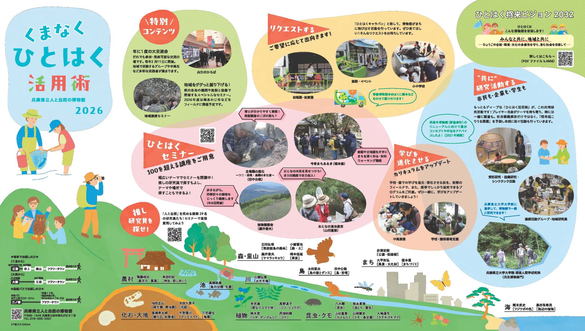 ひとはくの楽しみ方をまとめた「ひとはくガイド」、生涯学習の全体像をわかりやすくまとめた「ひとはく活用術」を作成しました。企画展を観る、セミナーに参加する、Kidsサンデー等のイベントに参加する、共に研究活動をする等、たくさんあるひとはくの活用方法をまとめました。