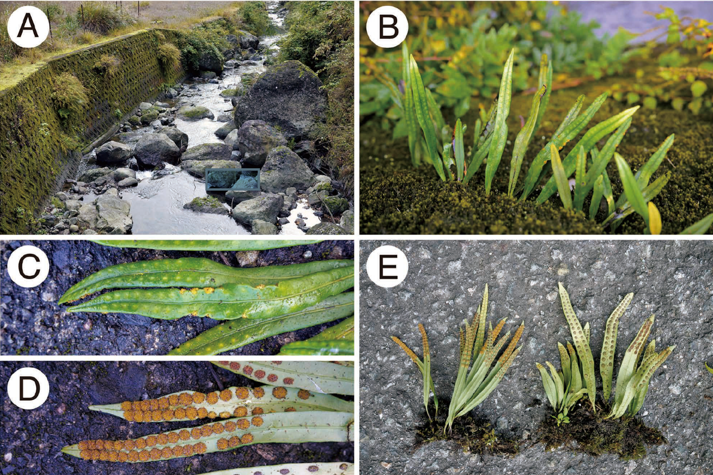 | タジマノキシノブの生育環境(A)と植物体(BーE) |